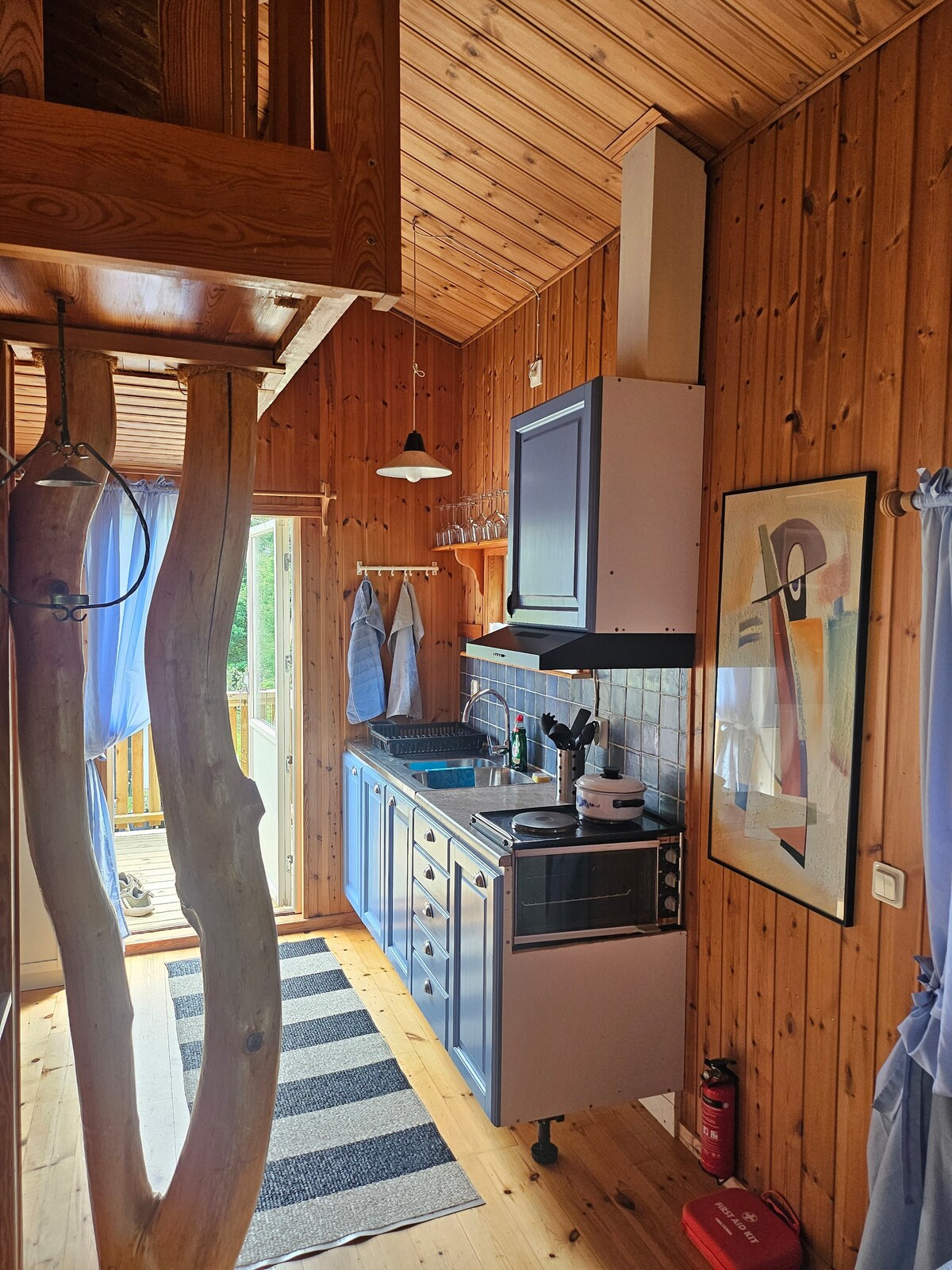 Pequeña cabaña en el valle de aprox. 30 m². Sala de estar con sofá cama, cocina, comedor, inodoro/ducha, loft para dormir con dos colchones. Balcón orientado al sur, terraza con sol de la tarde y barbacoa, aparcamiento privado y pequeño jardín vallado en la parte trasera. En la temporada adecuada, hay fresas y fresas en el jardín. Situado en la reserva natural de Haverdals en Villshärad. A 10 km al norte de Halmstad, a aproximadamente 1 km del mar. La casa rural se encuentra junto a la vivienda. Se admiten mascotas con una pequeña tarifa.