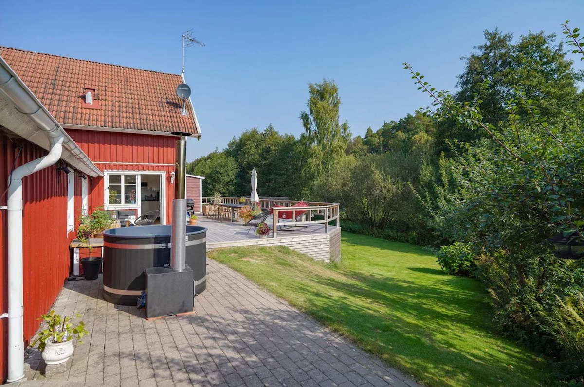 Casa de vacaciones de nueva construcción (2020-2021) ubicada en un cabo sin vecinos a la vista. Pequeña playa privada poco profunda con barco y motor eléctrico. Estufa de leña en el salón. Buena pesca con zander, perca, lucio, etc. Buen wifi. Sauna. Hongos y bayas. Estacionamiento grande privado en la parcela. Actividades cercanas : Isaberg Mountain Resort, High Chaparral, Store Mosse National Park, Ge-Kås Ullared, Knystaria pizzeria , Knystaforsen (guía blanco) Tiraholms Fisk Aquí vives lujosamente pero al mismo tiempo con la sensación de «volver a la naturaleza»