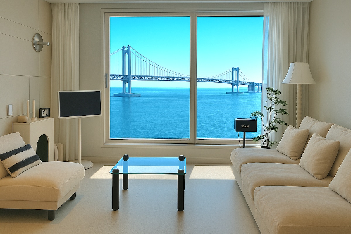 [Alojamiento legal con un 30 % de descuento nuevo] Vista completa al mar del puente Gwangan/Purificador de agua/3 habitaciones (2 dormitorios + sala de estar) Hotel con aire acondicionado The Market
