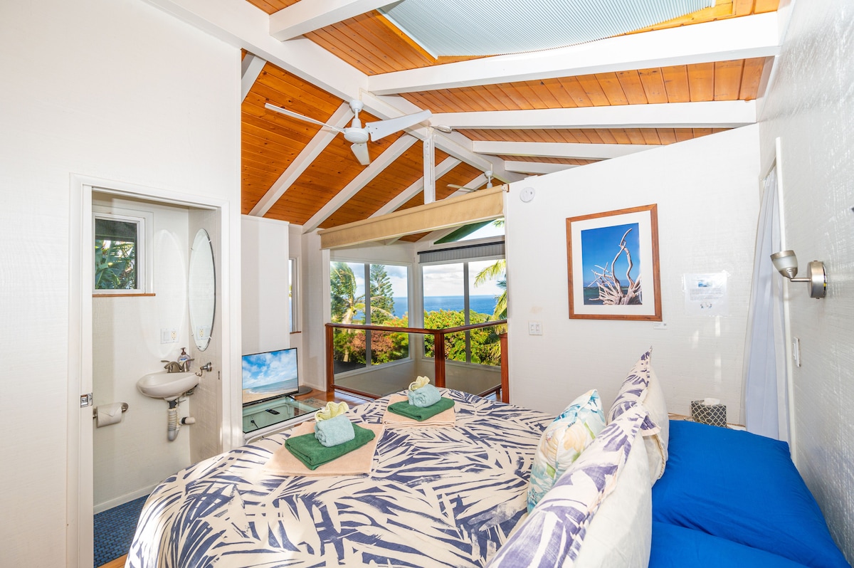 NOTA: Esta estadía en una granja no se eliminará gradualmente por las regulaciones del condado. Muchos condominios frente al mar están actualmente bajo amenaza de una eliminación gradual. Las estadías en granjas son un “uso permitido” en granjas agrícolas de buena fe según la ley del estado de Hawái. Ten la seguridad de que tu reservación aquí estará a salvo de la interferencia del gobierno. Esta ecléctica cabaña hawaiana antigua está encaramada en lo alto de una pintoresca garganta selvática con impresionantes vistas en todas direcciones. Abierto y fresco; la atención al detalle brilla en cada faceta.