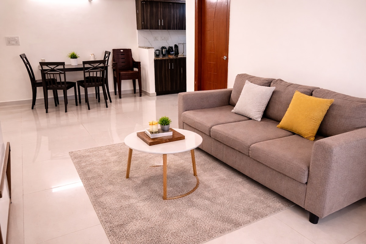 Welcome to your home away from home! This stylish and spacious 2BHK apartment is perfect for families, couples, or business travelers looking for comfort, convenience, and a touch of luxury. 2 comfortable bedrooms with queen-size beds, fresh linens, and ample storage A cozy living area with a smart TV, comfy sofa, and warm lighting for relaxing evenings Fully equipped kitchen with a fridge, stove, and all the essentials for cooking