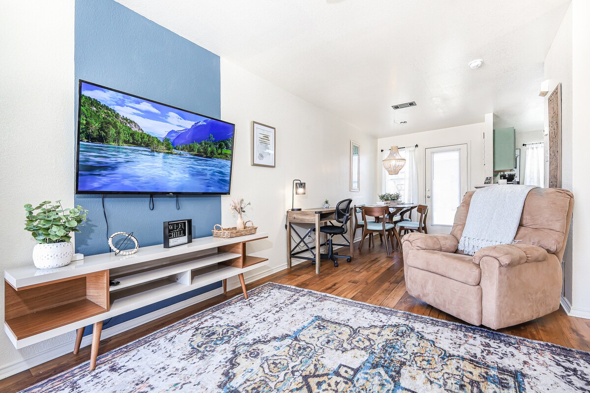 Welcome to ZRoyalStay apartment, where you can lounge in unparalleled comfort in our 2-br, 1-ba unit – ideal for both short and extended stays. We have a remarkable offer that not only saves you money but also ensures the highest level of comfort during your TDY or per diem travel. Book with ZRoyal Stay today. As you enter, you'll be greeted by a cozy living room featuring a comfortable sofa, a 50-inch Smart TV, and lightning-fast 200 MB high-speed WiFi to cater to your work or streaming needs.