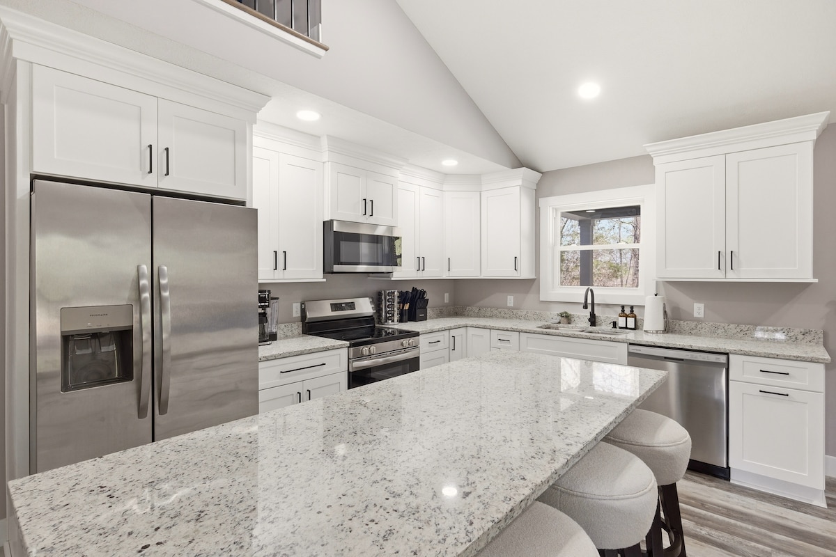 Meemac Manor, has a central courtyard/firepit flanked by 2 Bldgs both bldgs are included. Barndo 1 is 3 BR, primary w/king bed, loft w/single hide-a-bed & desk, fully eqpd. kitchen, 2 full baths, great room w/glass garage door to deck, grill & Blackstone. Barndo 2, has large BR w/king bed & full bath, a celebration room w/karaoke stage, costumes, 4 mics, piano, TV, VIP balcony, kitchenette, air hockey, ping pong, PacMan, dart board, & deck with hot tub. 84' of covered porches w/rocking chairs.