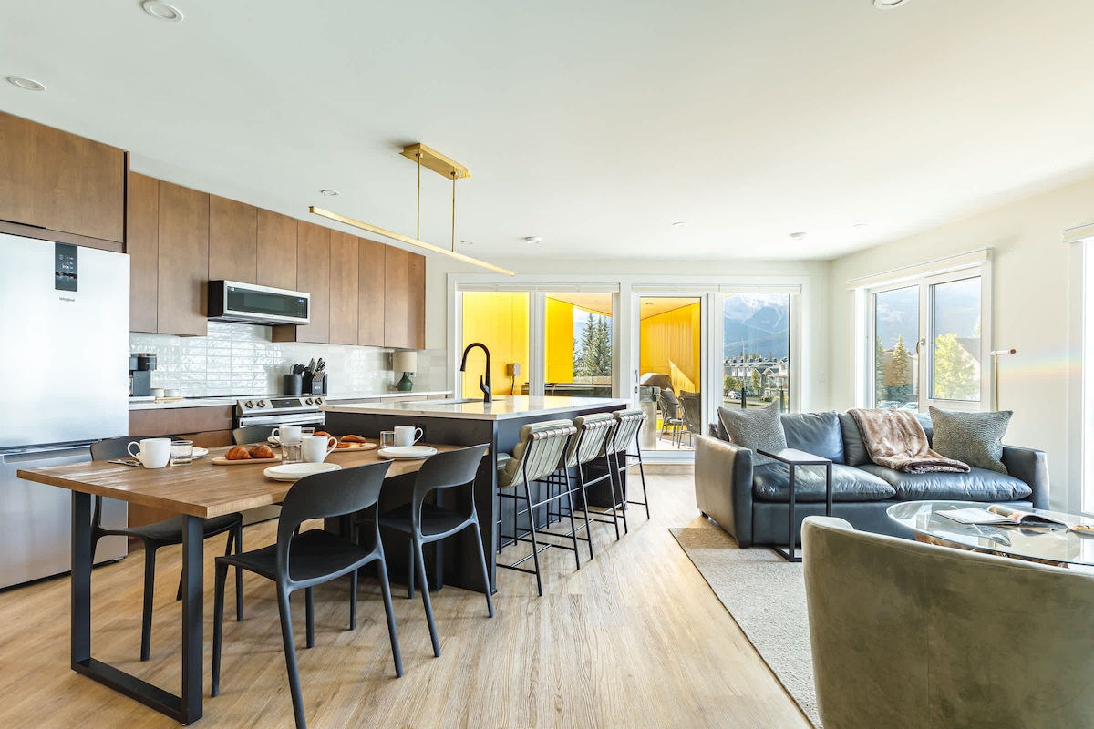Oferta especial de abril de 2026: Hospédese 3 noches y obtenga la cuarta noche gratis. Despiértese con impresionantes vistas a la montaña en esta luminosa casa adosada de esquina de 2 dormitorios y 2 pisos, situada entre Banff y Canmore, a solo 5 minutos de la entrada del Parque Nacional Banff. Las ventanas orientadas al sur y bañadas por el sol ofrecen vistas a las emblemáticas Three Sisters y al monte Rundle. La casa cuenta con detalles de inspiración local, como cerámica hecha a mano por Coralee y muebles de madera reciclada, y tiene capacidad para alojar cómodamente a 6 huéspedes, con espacio para hasta 8 personas.