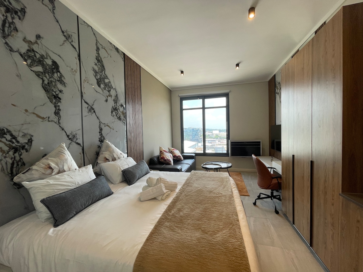 Moderno apartamento de un dormitorio con vistas al vibrante Menlyn Maine A poca distancia a pie de Menlyn Maine para las mejores compras, restaurantes, entretenimiento, vida nocturna y todo lo que Time Square Casino tiene para ofrecer. Cerca del hospital, farmacia y servicios de emergencia CintoCare y Fairy Glen. Este apartamento está totalmente amueblado con todo lo necesario para una estancia corta o larga. Sin cortes de energía. Ven y disfruta de una cena en el restaurante privado de la azotea o date un baño en la piscina infinita de la planta 16.