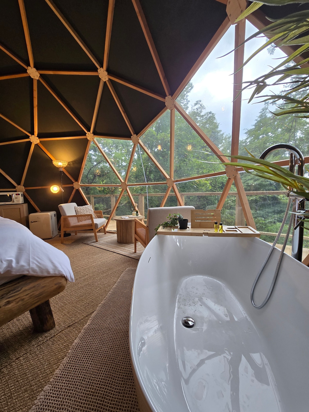 Escápate a nuestra cúpula bohemia en plena naturaleza. Un cálido refugio para una pausa fuera del tiempo. Disfruta de una gran cama tamaño king, una zona de relajación y un jacuzzi privado en la terraza para una experiencia única en el corazón del bosque. Opcionalmente, un desayuno a 15 €/persona entregado en la terraza y una botella de champán a 45 € para hacer que su estancia sea inolvidable.