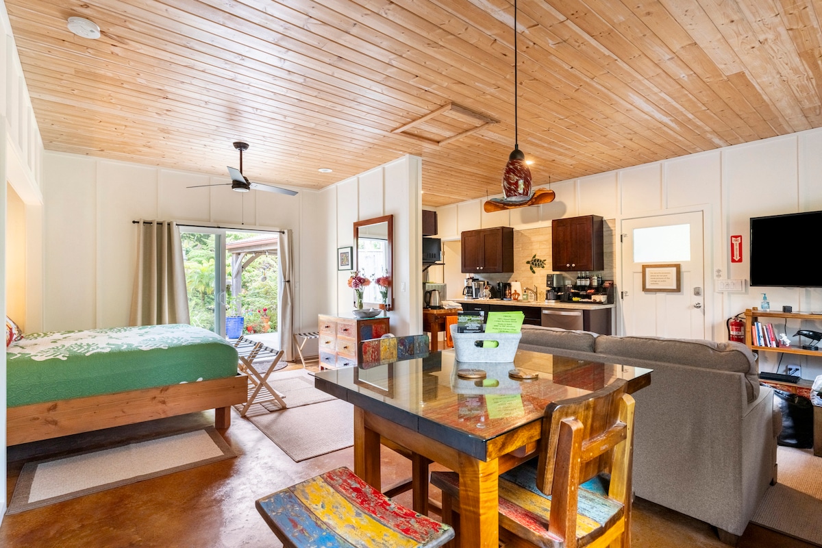 Aloha, recién casados, aventureros y amantes de la naturaleza, ¡tu inolvidable escapada hawaiana comienza aquí! Experimenta la vida en la selva tropical en nuestra casa de huéspedes minimalista con un Lanai privado. Respira aire fresco, escucha la naturaleza y empápate del ambiente isleño de Hawái. Perfectamente ubicado entre las cascadas y playas de Hilo y el famoso Parque Nacional de los Volcanes. Escápate y desconecta en nuestro refugio ecológico. Es el lugar ideal para relajarse y recargar energías.