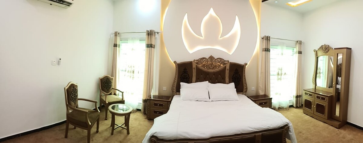 es un apartamento de lujo con habitación de invitados. Una familia de 4 personas puede alojarse fácilmente, tiene todas las instalaciones modernas y está ubicado en la carretera de turbela, Islamabad y peshawer está a 45 minutos en coche. Pesca y visitas turísticas. Los huéspedes pueden disfrutar de la vida en el campo y, como se encuentra junto a la sala de bodas y la plaza comercial, disfrutarás de una comida matrimonial tradicional sin ningún cargo. Ve a pescar que la gente local llevará al río sind que está cerca, o visita la presa de tarbela, que está a 6 millas de distancia.