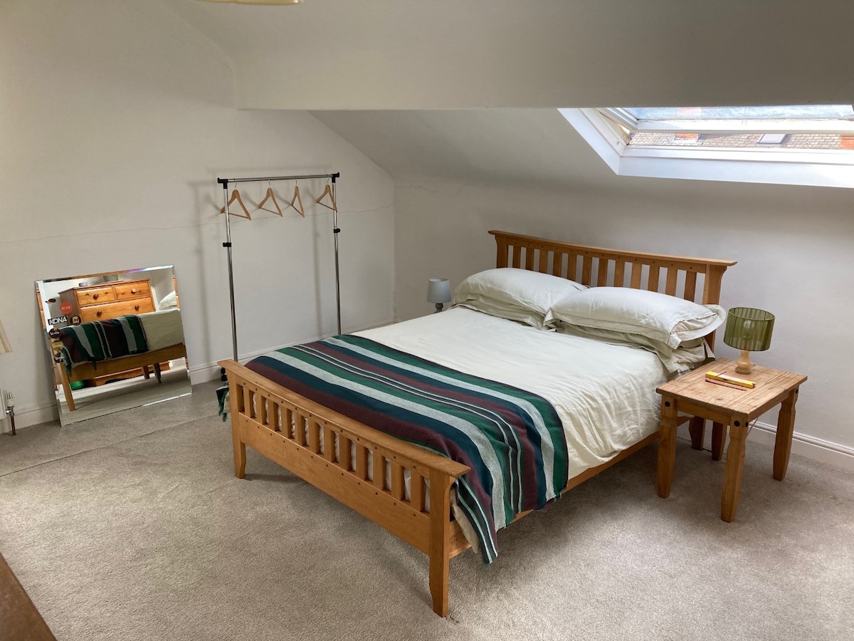Bienvenido a nuestro cómodo apartamento independiente en el último piso de nuestra casa victoriana con terraza. El apartamento tiene vistas a nuestro parque local, a la parcela comunitaria y al campo de golf. Disfruta de un moderno baño con ducha, interiores luminosos y una cocina privada con todas las comodidades que necesitarás para una estancia larga. A solo 3 minutos a pie de la parada de autobús y a 15 minutos en coche del centro de la ciudad de Leeds, este espacio es ideal para una estancia cómoda y práctica en las afueras de Leeds.