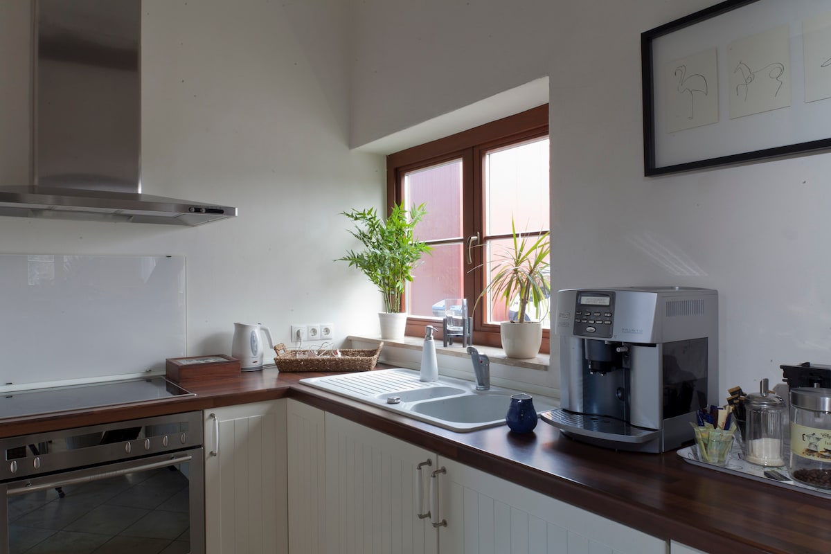 Siéntate y relájate en este alojamiento tranquilo y elegante. El bosque y la naturaleza están a pocos minutos. El moderno apartamento de 60 metros cuadrados con dos habitaciones y un hermoso balcón orientado al sur es una de ellas. El dormitorio está equipado con una cama boxspring nueva y de alta calidad (200x200 cm). En la sala de estar hay un moderno paisaje urbano que se puede convertir en una cómoda cama doble. El apartamento también es ideal para los visitantes de la feria.