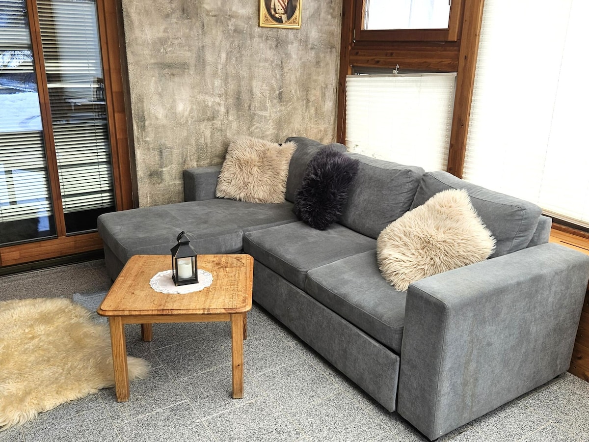 Casa de campo de 73 metros cuadrados en una ubicación tranquila en las afueras con espacio para hasta 5 personas, 2 dormitorios, una gran sala de estar con sofá cama de matrimonio, cocina, sala de estar, baño con inodoro y antesala. Las terrazas sur y norte ofrecen suficiente espacio para comidas y relajantes con vistas a montañas, prados y bosques. En el jardín de 250 m2 encontrarás literas a la sombra debajo de los árboles. Una amplia cochera con una caja de pared está disponible para su vehículo. Hay otra plaza de aparcamiento disponible delante de la casa.