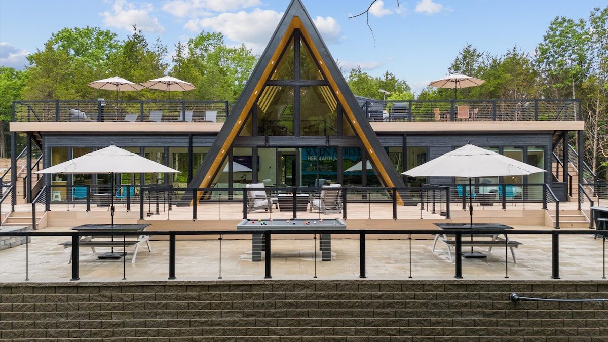¡Vuelve a conectar con TU GENTE en Seven Acres Escape en Hermann, MO, la casa en forma de A más lujosa del Medio Oeste! • Sueño profundo en 5 suites únicas con camas tamaño king y baños privados • Paz total en tu bañera de hidromasaje privada, sauna, yoga, fogatas y espacios de descanso • Disfruta de las terrazas en las azoteas, hechas para el sol, las estrellas y la conexión • Diversión sin fin en el teatro con bar, sala de juegos, PS5, mesa de billar, petanca y más • Serenidad a través de ventanas de suelo a techo en la naturaleza Reserva tu estancia inolvidable antes de que se agote.