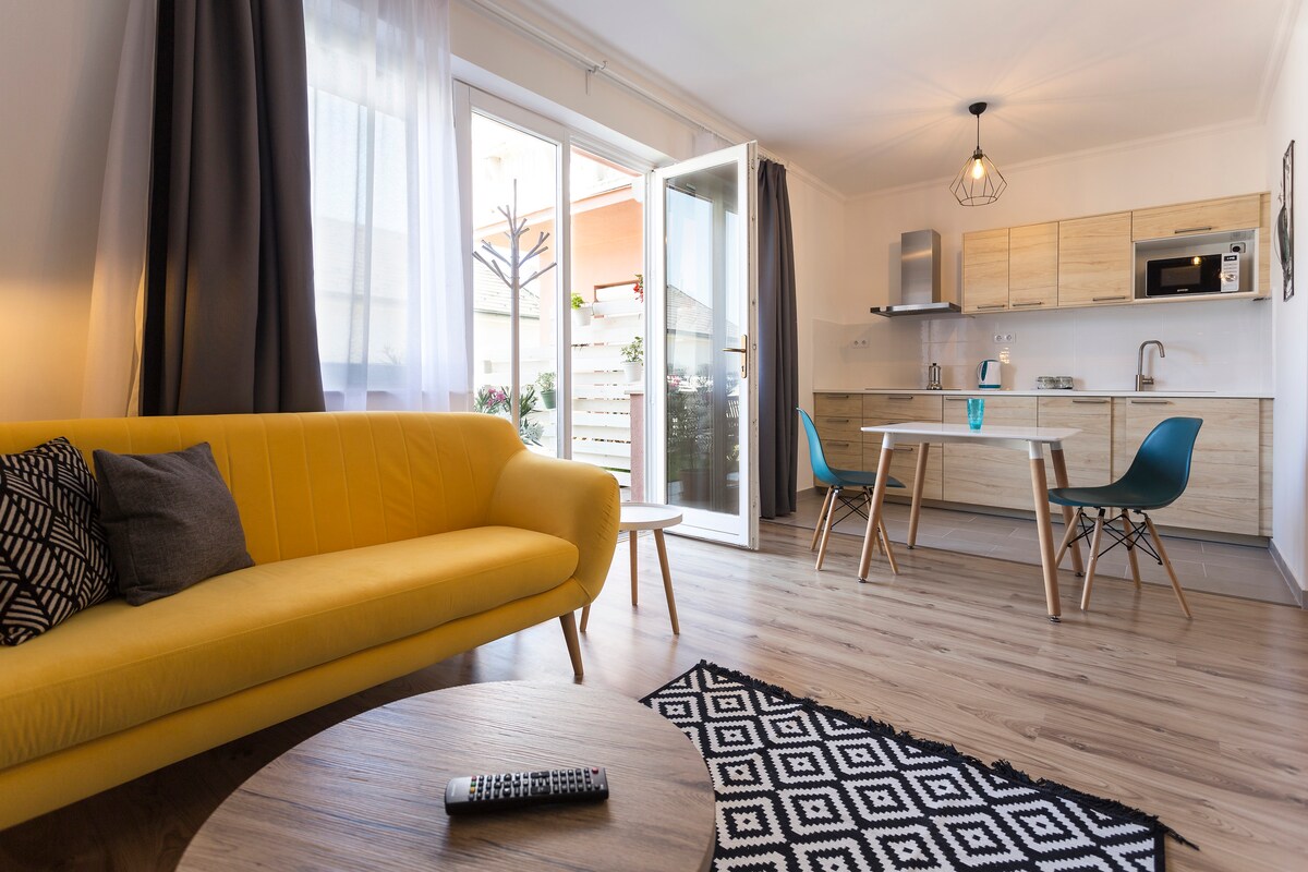 **** (4* szálláshely) Este apartamento tranquilo, tranquilo, nuevo y muy moderno y elegante, ubicado en el centro, tiene capacidad para 2-3 personas. A pocos minutos de tiendas, panaderías, correos, cafeterías y restaurantes. 150 m - Calle peatonal 550 m - Héviz Thermal Lake El apartotel tiene 1 dormitorio y una sala de estar cocina con TV y un sofá Hay aparcamiento gratuito en la parte delantera del edificio. Está tan cerca del lago que no tendrás que utilizar tu coche en absoluto :) El apartamento no es apto para menores de 2 años.