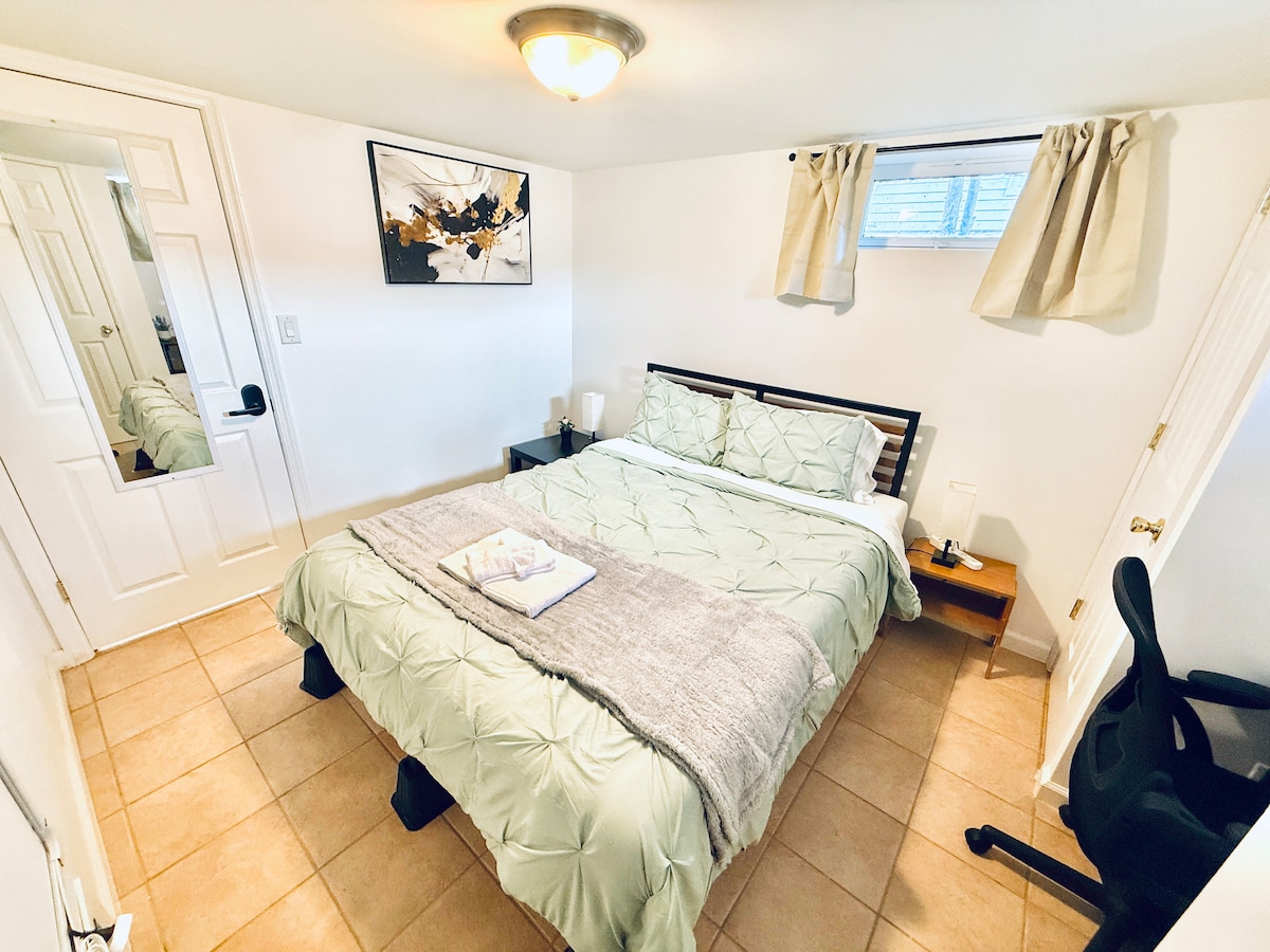 Vuelve a conectarte con tus seres queridos en este lugar apto para familias. El espacio está en un sótano. Incluye cocina completa, comedor, sala de estar, baño completo y dormitorio separado. La lavandería proporcionada y el baño en la lavandería es un espacio compartido, en el que otras personas también usarán. No dudes en usar la lavadora y secadora cuando esté disponible. Para un huésped adicional aparte de los 3 huéspedes incluidos: 20 $ por noche por huésped