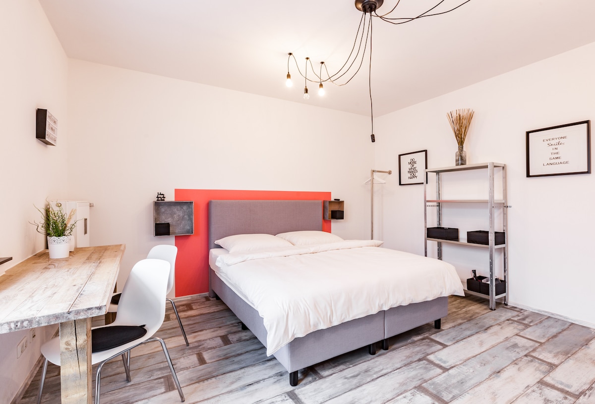 Soleado y exclusivo apartamento de 1 habitación en el centro de Colonia para 1-2 personas; planta abierta, calefacción por suelo radiante, cama cómoda (1,40 x 2 m), elegante sala de estar, cocina, muebles empotrados de alta calidad; diseño de baño moderno con luz natural/mobiliario exclusivo; wifi de alta velocidad de hasta 100 mbit/seg; diseño de iluminación elaborado. A 3 minutos de las calles comerciales, restaurantes y bares en la puerta, a 800 metros de la catedral, autopista A57 en coche en 5 minutos. Reservas de 90 días o más a petición.