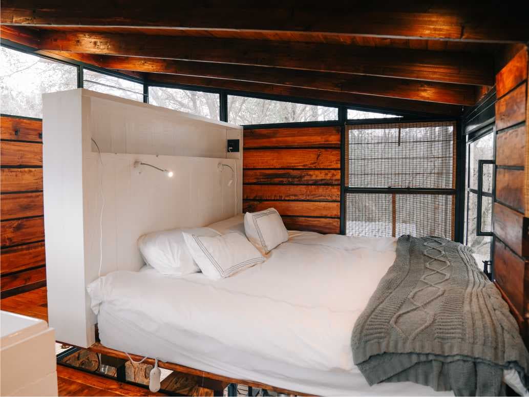 La cabaña Mana es una unidad independiente para 2 personas. Una acogedora cabaña de roca y madera con grandes ventanales con vistas a los árboles por todos lados. La minicasa fue diseñada con la menor huella posible, maximizando los espacios exteriores que cuentan con bañera, cama de día, chimenea, baño y terraza de estar. El espacio es acogedor y está bellamente diseñado. En la planta baja tienes una cocina con una isla comedor central, sofá, quemador de leña y escritorio. Arriba, el acogedor dormitorio cuenta con una cama súper king, baño y baño.