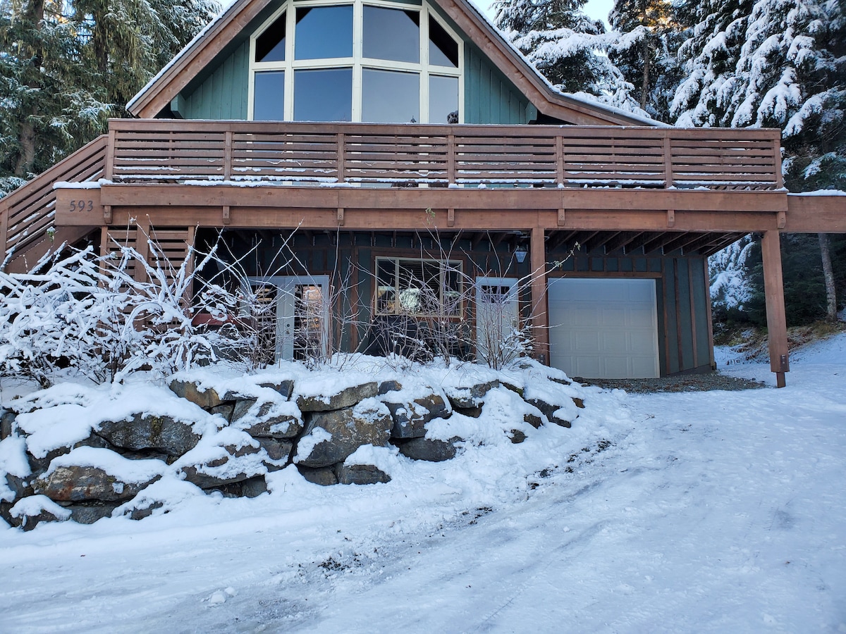 Esta casa de estilo chalet recientemente remodelada cuenta con techos blancos, paredes de cedro y vigas abiertas. Los grandes ventanales revelan la cordillera de Chugach. Sus conceptos de piso abierto tienen la sensación de una cabaña de montaña con las modernas mejoras de una casa adosada. El loft del dormitorio cuenta con un hermoso diseño arquitectónico y comodidad. Este lugar es una escapada maravillosa para una pareja o una familia de hasta 6 personas. El vecino Kincaid State Park, con vistas al mar y un gran sistema de senderos, ofrece una variedad de actividades
