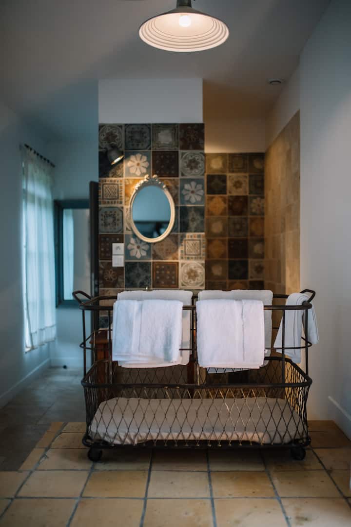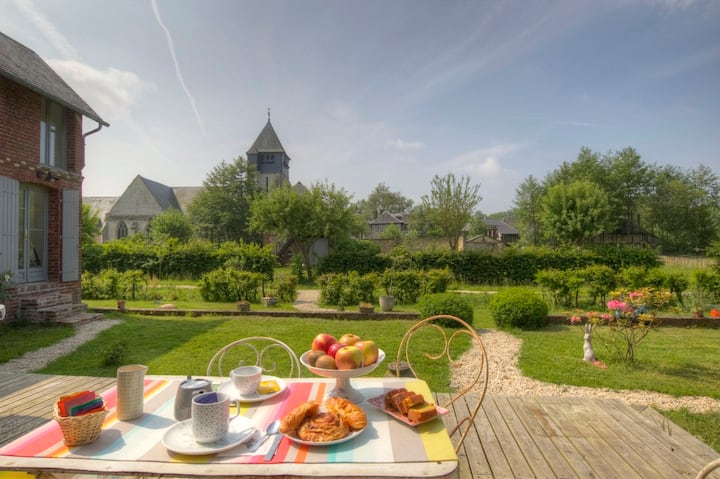 En una antigua granja del país de Auge, alojamiento independiente con baño privado y aseo privado. Acceso al estudio independiente. Cocina común disponible. Acceso al jardín y al río. Rutas de senderismo desde la casa
