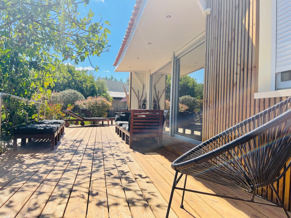 Casa de tipo T4, de planta baja a 200 m del océano. Cocina totalmente equipada (horno, placa de inducción, lavavajillas, microondas, cafetera, hervidor de agua, refrigerador/congelador, etc.), 3 dormitorios con camas dobles y vestidor en cada uno, gran salón con sofá + TV, los accesorios de la terraza están invernados y, por lo tanto, son menos accesibles de noviembre a abril. Capacidad para 6 personas. ¡Ideal para unas vacaciones en familia o con amigos!