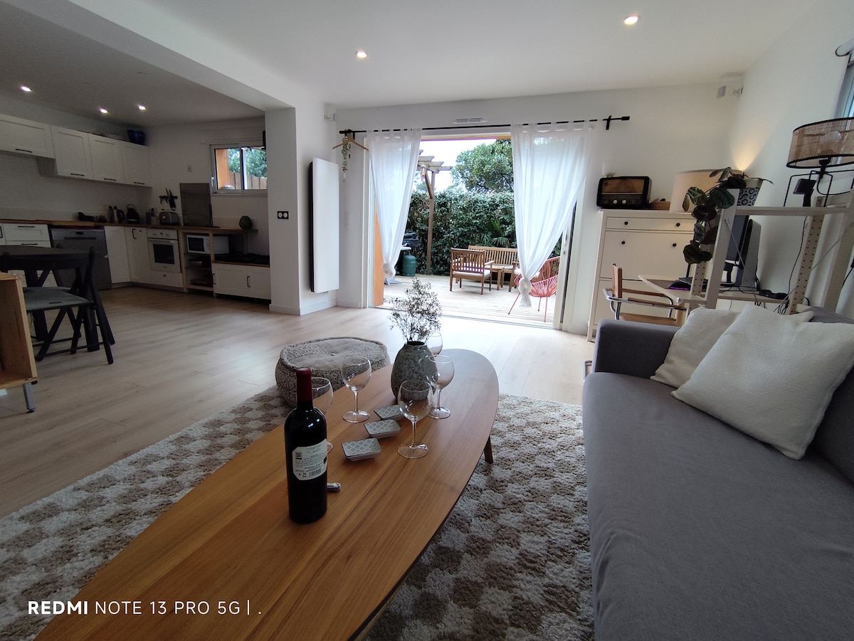 Minimum 7 jours du samedi au samedi en juillet et août. Maison moderne entièrement rénovée et équipée (CLIM., wifi, machines à laver linge et vaisselle, TV…) avec grande terrasse, JARDIN clôturé et PARKING gratuit. Idéalement située dans rue calme, à 2 minutes à pied Océan et commerces du centre. Supermarché, restaurants, loueur vélos… au bout de la rue ! Composition : cuisine équipée ouverte, salon, 2 chambres, 2 salles de douche, 2 WC. Pour 5 à 7 personnes. Kit linge en option à 15 €/personne.