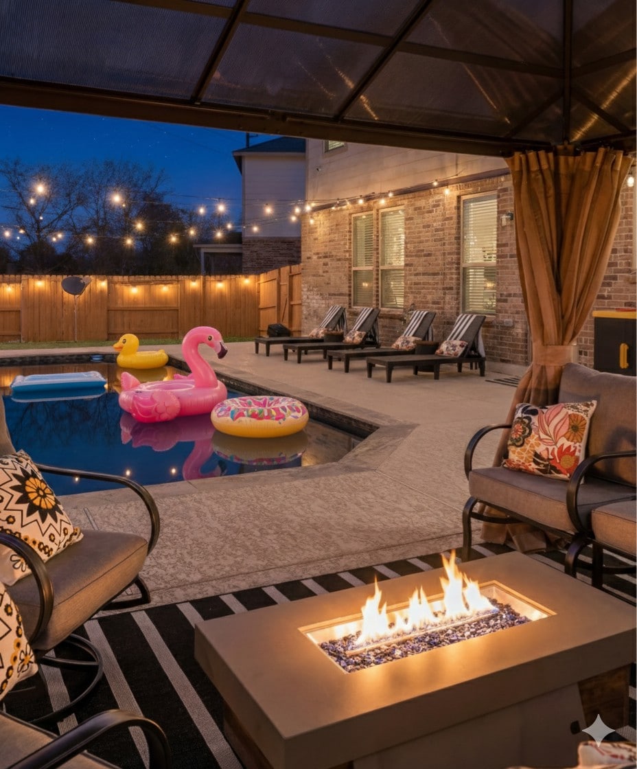 ¡Te damos la bienvenida a tu refugio de lujo de 4 dormitorios! Disfruta de una piscina climatizada, un cine en casa privado y una amplia sala de estar perfecta para familias o grupos. 4 dormitorios de lujo y 3 baños y medio Cocina del chef totalmente equipada Wifi rápido y espacio para trabajar Asientos y parrilla en el patio trasero A minutos de restaurantes, tiendas y las principales autopistas, pero escondido en un barrio tranquilo para noches de descanso. ¡Reserva ahora para asegurarte las fechas y empezar a planificar una estancia inolvidable!