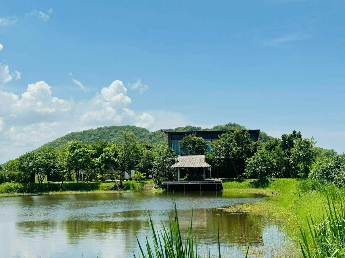 Turtle Eco Luxe Villa 2024 Best Design Una villa única en forma de tortuga ubicada en un estanque de loto que rodea por la naturaleza, el valle de Khao Tao y la playa de Sai Noi. Villa estudio privada de una habitación en una habitación que comprende un baño espacioso y una terraza al aire libre junto al agua. Cafetería y restaurante de diseño único donde puedes pedir el desayuno, el almuerzo y la cena -2024 Destacado en la revista Room Book 2024 Los mejores diseños - Premio de diseño global. Tenemos 3 villas con tortugas, consulta mi anuncio si necesitas más espacio.