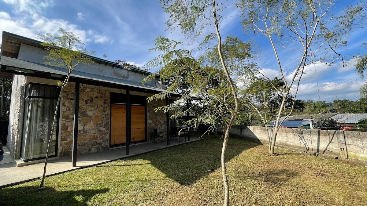 Relájate con toda la familia en este alojamiento donde la tranquilidad se respira. Cabaña con cama matrimonial, baño completo en recamara, dos sofás amplios, cocina integral, medio baño, comedor y terraza con asador. cuenta con espacio libre para caminar por el campo y acceso al río.