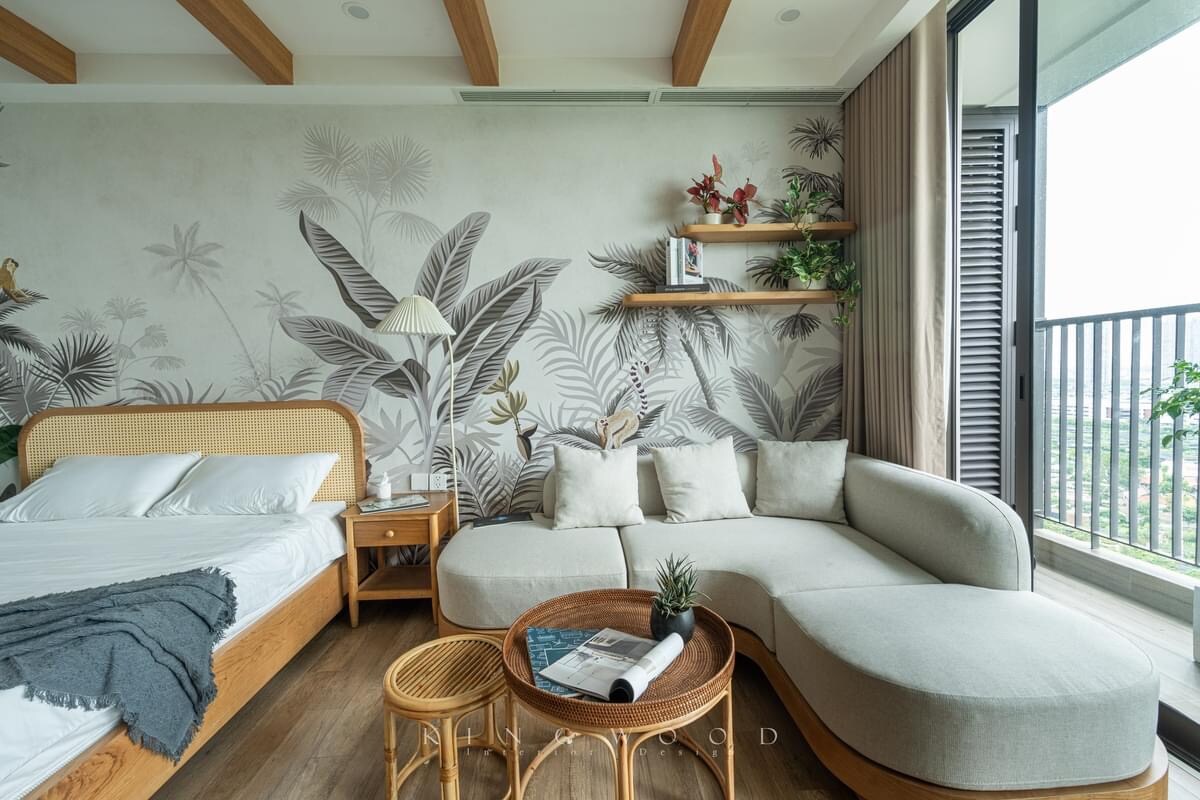 Entra en un espacio que te hará sentir como si estuvieras paseando por un bosque tropical. Cálidas vigas de madera en el techo, vibrantes murales de hojas de palmera que parecen invitar a la brisa del océano. Una acogedora cama doble está frente al elegante sofá, donde puedes disfrutar de películas en la gran pantalla de proyección. Cocina de madera natural con encantadoras puertas de armario de ratán, sistema de agua pura filtrada. La iluminación dorada suave y la vegetación fresca en cada rincón crean un ambiente absolutamente tranquilo. Nota: las piscinas no son gratuitas. La tarifa es de alrededor de 130.000 VND