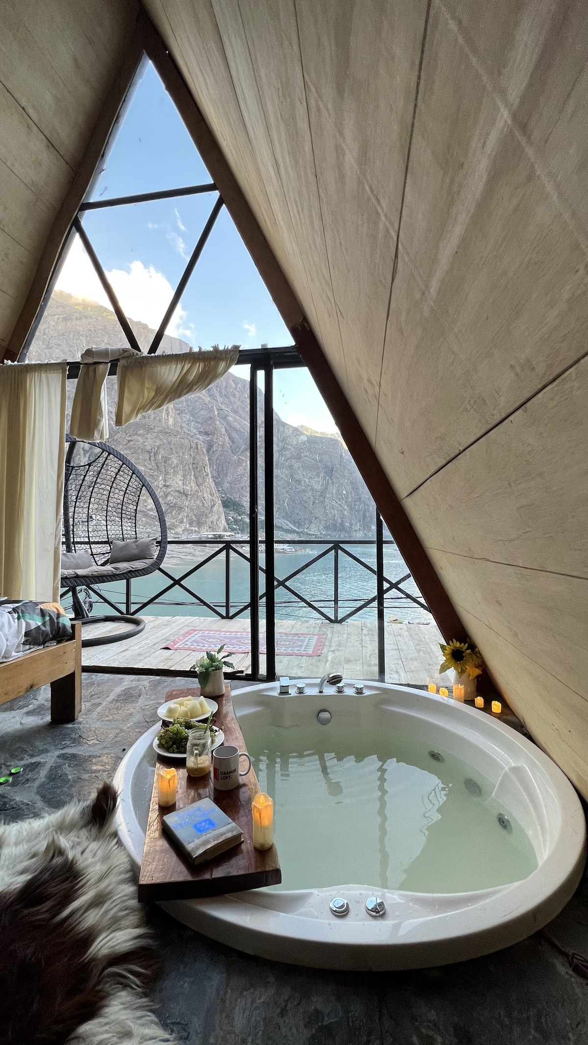 Our A frames opens up to uninterrupted lake and mountain views, with a private jacuzzi where you can soak while looking out at the water. Mornings here are quiet, evenings are slower, and nights end around a bonfire under the stars. Inside, the wooden A-frame is warm, minimal, and comfortable, with everything you need but the real experience is outside your door. This isn’t a typical hotel stay. It’s quieter, more personal, and intentionally simple