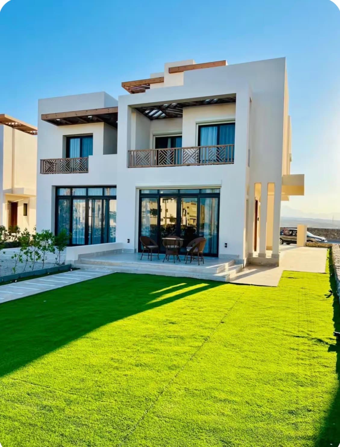 This unique place has a style Green Valley offers a calm and elegant atmosphere where comfort meets open views. From the private balcony, soft wicker seating creates the perfect spot to relax and enjoy the fresh air. The view opens onto beautifully designed buildings with warm tones and classic architectural details, all under a wide blue sky that adds a feeling of space and serenity.