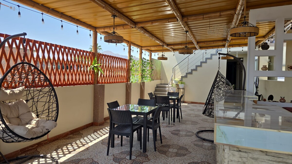 Este encantador y exclusivo espacio te hará sentir como en casa. Disfruta de las instalaciones de un hospedaje pero con la modalidad Airbnb en donde podrás cocinar, hacer parrilla, entrar a la piscina, usar el estacionamiento privado, ingresar con tus mascotas en el caso de tenerlas, además de contar con la increíble atención del personal en el lugar haciéndote sentir en familia, todo esto a cinco minutos en carro de Huacachina el oasis iqueño.
