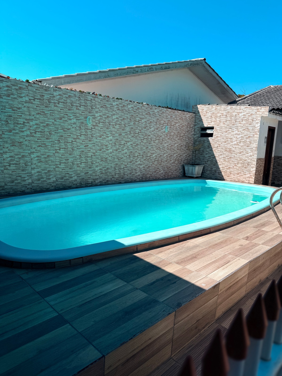 casa bem arejada, com três quartos com camas de casal, churrasqueira, piscina, garagem , toda cercada, rua pavimentada, local sossegado. a distancia ate a faixa de arei seria 430metros. Possui monitoramento eletrônico p total segurança dos hospedes.
