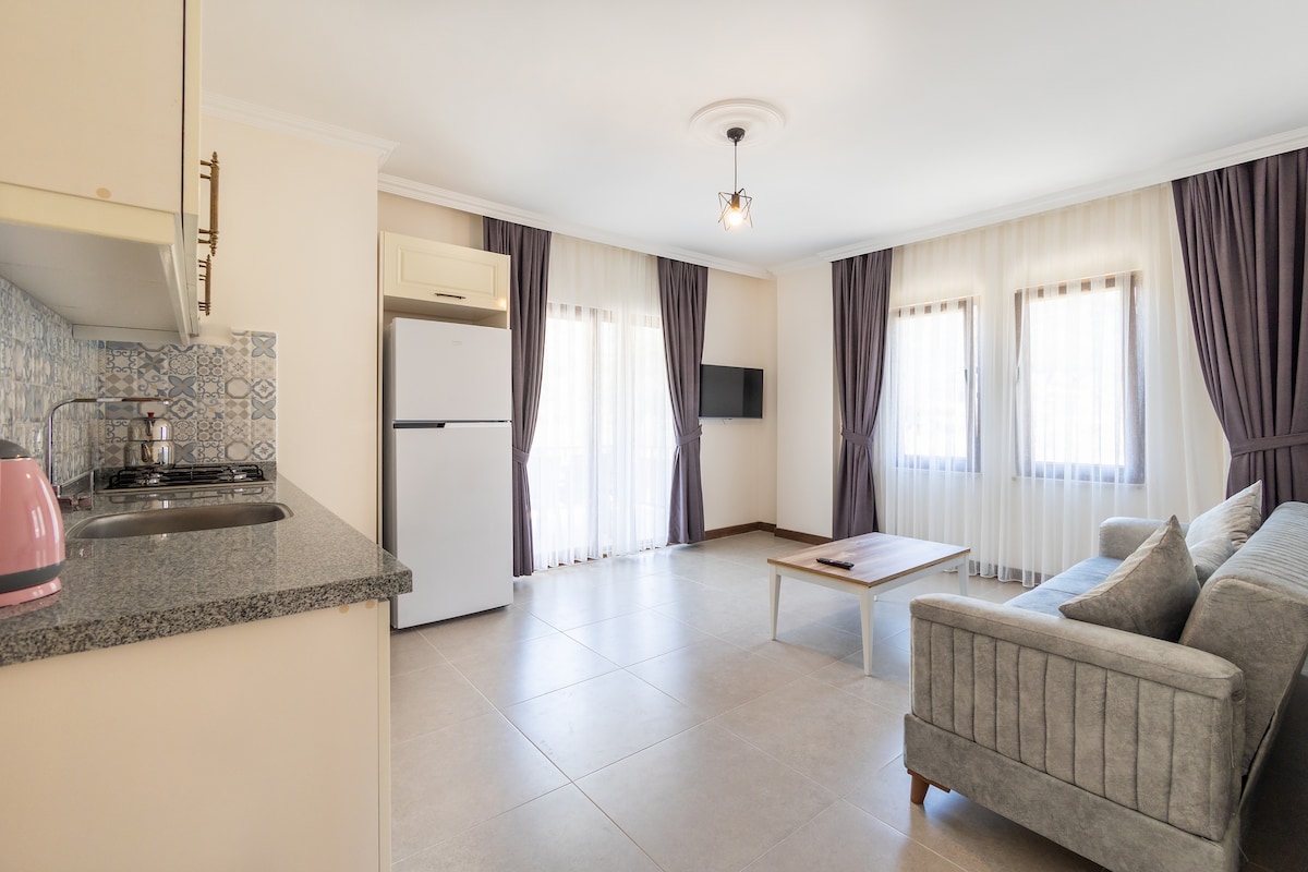 Puedes relajarte en familia en este alojamiento tranquilo. Nuestros departamentos 1+1 son nuevos y espaciosos. Dentro de los departamentos, hay TV, lavadora, aire acondicionado,nevera, cafetera y todos los utensilios de cocina. En términos de ubicación, está a 5_10 minutos en coche de muchas bahías y tiene un balcón y jardín muy grandes. Puede haber una barbacoa y un samovar en nuestro jardín. Ofrece una estancia muy cómoda para familias con niños. Proporciona una gran paz con vistas a la montaña. Esperamos disfrutar de unas vacaciones rodeados de naturaleza prístina
