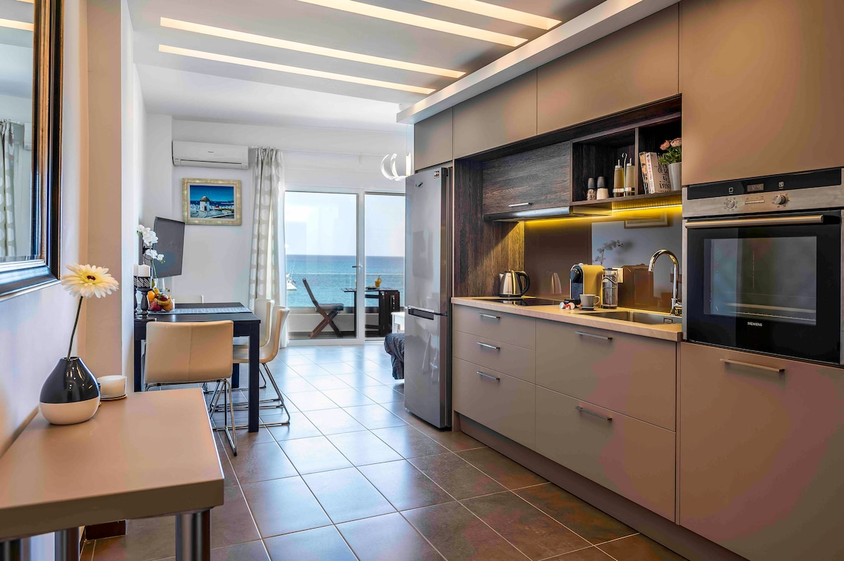 In southeast Crete and literally next to the sea is the apartment with a modern design and aesthetics, offering comfort and luxury at the same time. In the first light of the day, the gaze faces from the large windows the crystalline sea and the endless blue to the horizon, while the sound of the waves travels with them. Indulge in the senses and experience beautiful moments in a unique space.