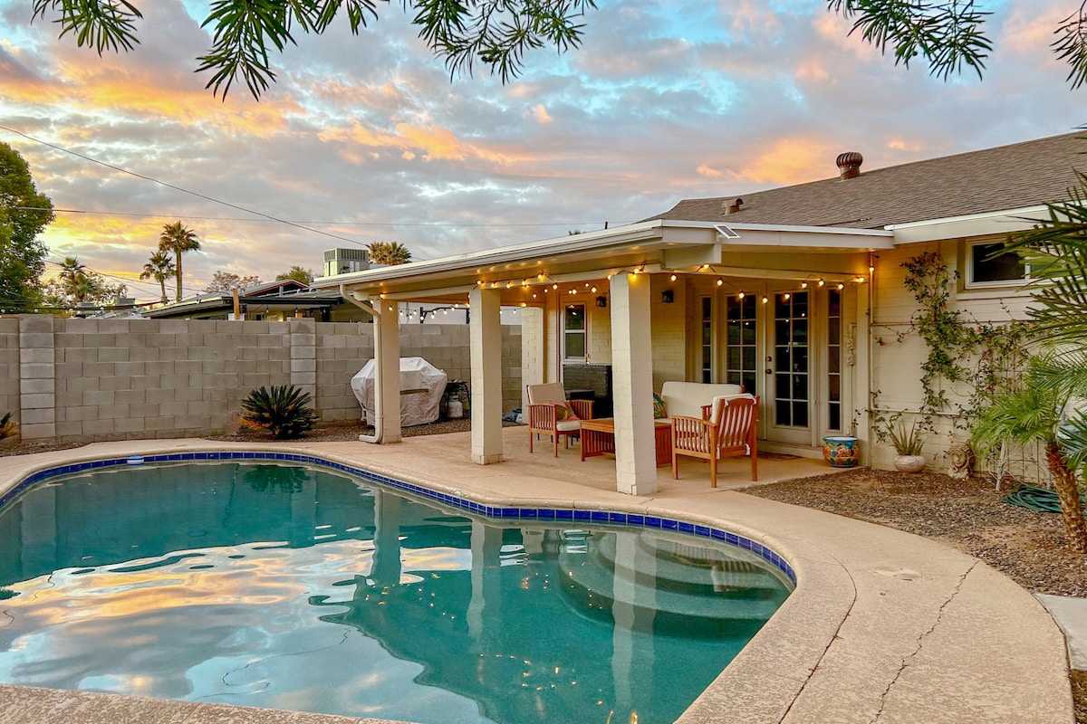 This home is in the center of Scottsdale just minutes from Old Town, Talking Stick Casino, Spring Training, parks & walking paths, shopping, and more! The backyard features a pool, hot tub, built-in grill, dining area, and turf. Enjoy the incredible sunsets under a sea of string lights and a cozy fire pit. This family-friendly home comes stocked with board games, lawn games, live TV, and high-speed wifi. Our guests love the comfort of this home, a perfect place to relax, unwind, and have fun!