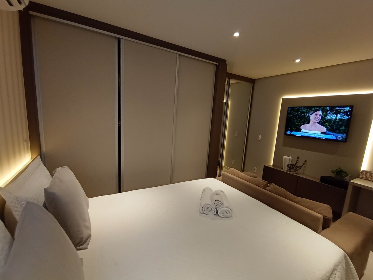 Nuevo apartamento de 1 dormitorio con cama doble y colchón queen size, Smart TV de 32", split de 9.000 Btu's, armarios y mesa de escritorio. Cocina con vitrocerámica, horno empotrado, microondas, nevera y parrilla giratoria. Área de servicio con lavadora/secadora. Sala de estar con Smart TV 48" y sofá cama para 2 personas. Calefacción de gas en la ducha, cocina y lavabo. Split de 12.000 Btu en el ambiente que abarca cocina, sala de estar y comedor. Cerca de los puntos turísticos Aurora y Maria Fumaça. Wifi.