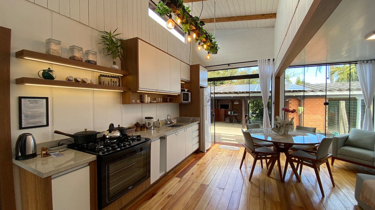 🏠 Casa Container com Quiosque, espaço inteiro no Coração de Imbé, próximo a restaurantes, lojas, mercados e 800m do calçadão beira-mar. A poucos metros da Barra dos Botos, do Lago Braço Morto e de Tramandaí. 🌞
