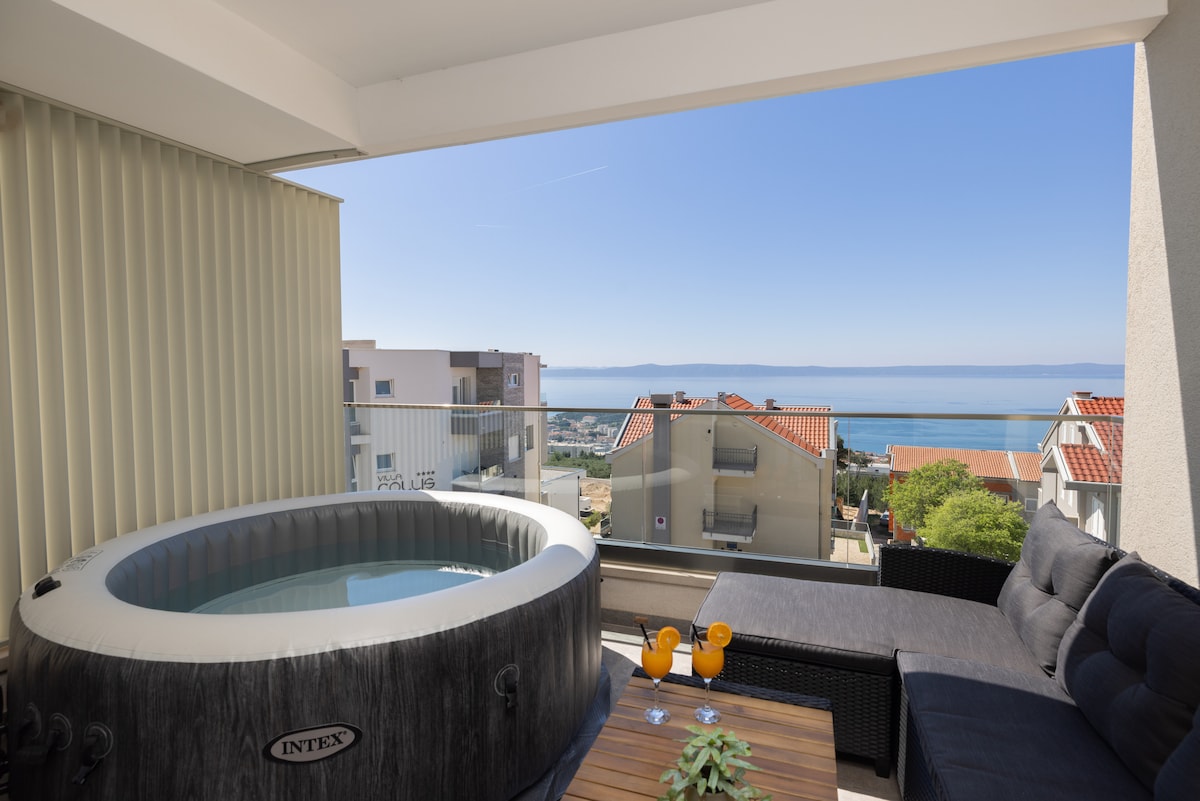 A 7 minutos a pie de la playa Ratac Makarska, el exclusivo ático Big Blue con jacuzzi privado cuenta con alojamientos con acceso a un jacuzzi. Los huéspedes pueden beneficiarse de aparcamiento privado en el lugar y wifi de cortesía. También hay asientos al aire libre disponibles en el apartamento. Con balcón y vistas al mar, el espacioso apartamento incluye 2 dormitorios, sala de estar, TV de pantalla plana, cocina equipada y 2 baños con jacuzzi y ducha. El apartamento incluye toallas y ropa de cama.