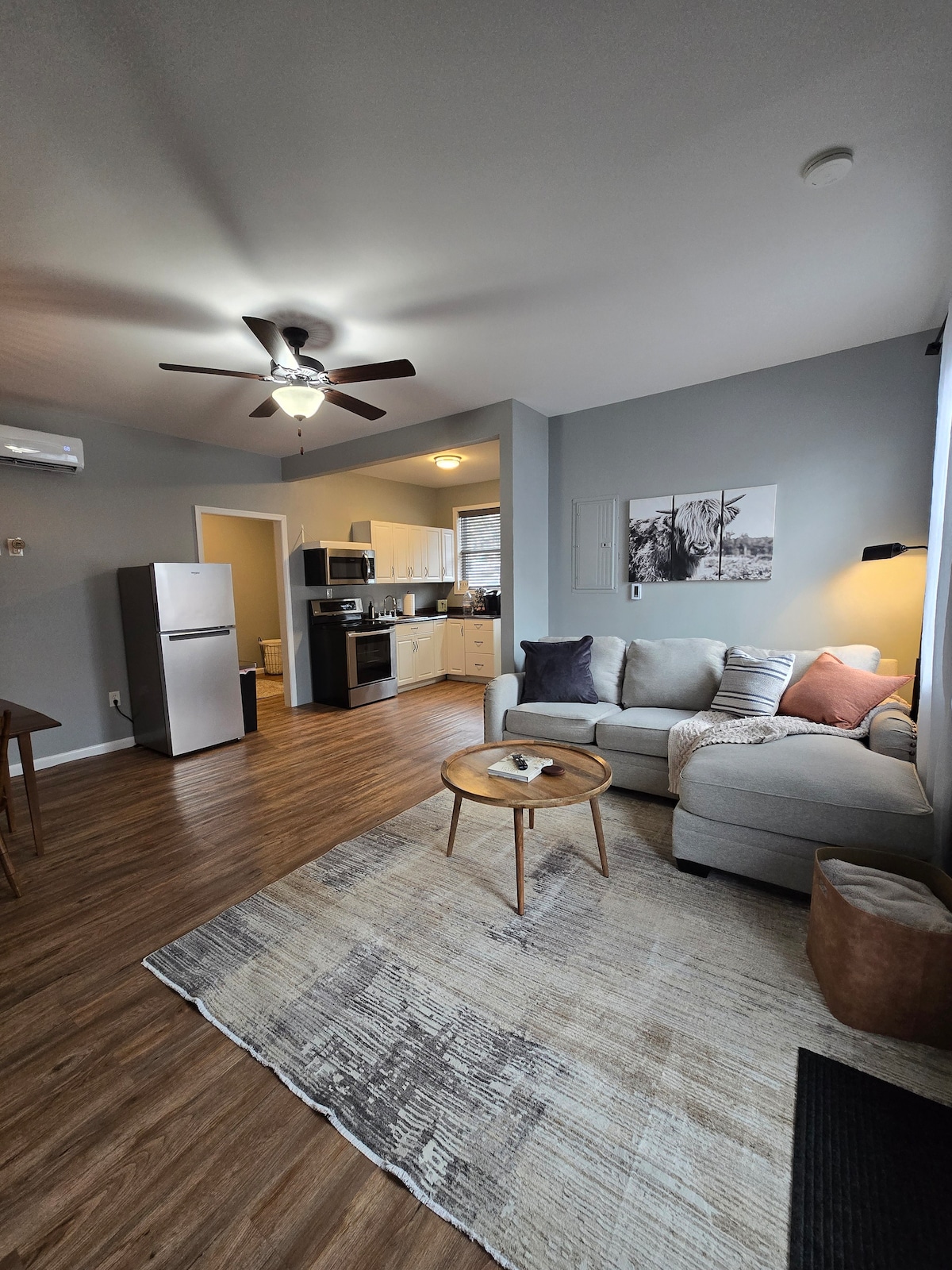 Relájate y disfruta de este acogedor apartamento recién reformado con una cama tamaño king, una acogedora sala de estar con un televisor inteligente para iniciar sesión en tus cuentas, comedor, cocina con todos los elementos esenciales para cocinar, baño completo, espacio de trabajo para los huéspedes que viajan mientras trabajan, lavadora y secadora en la unidad. Los huéspedes también pueden disfrutar de la terraza con vistas al patio trasero/bosque y zona de fogata. Es posible que veas/conozcas a Dave (que vive al lado) cuando vaya y venga, es un gran vecino y respetará la privacidad de los huéspedes.