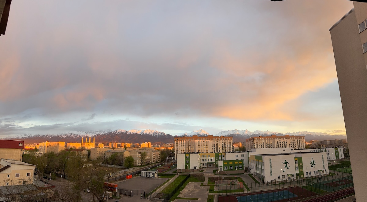 ¡Te damos la bienvenida a tu estancia ideal en Almaty! Disfruta de impresionantes vistas a la montaña y a la ciudad desde tu ventana. - A 7 minutos de la estación de metro. - Cama cómoda y sofá acogedor. - Cocina totalmente equipada. - Baño moderno con toallas y artículos de tocador limpios. - Wifi y SmartTV. ¡El apartamento está en un distrito seguro y animado, cerca de cafeterías, supermercados, farmacias, centros comerciales! Llegada autónoma disponible Siempre listo para ayudarte. No dudes en enviarnos un mensaje en cualquier momento. ¡Relájate, explora y siéntete en casa!