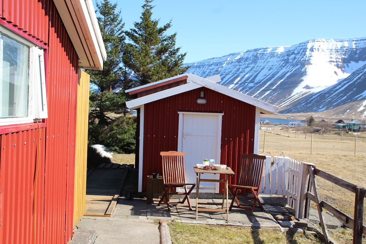La casa es pequeña, acogedora y acogedora con solárium y una vista a la parrilla. Nida en un amplio jardín cerca del mar y el puerto del pequeño pueblo pesquero de Bolungarvík Witch está rodeado de montañas en tres lados. La casa está en 2 plantas, en la planta baja hay una cocina abierta, sala de estar con sofá y baño con ducha. El segundo piso es un loft para dormir con 1 cama doble, una cuna de viaje está disponible bajo petición.