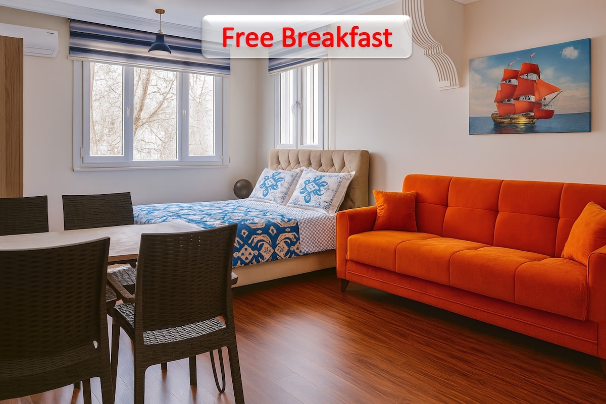 Durante su alojamiento en el corazón de Florya, uno de los distritos más habitables y céntricos de Estambul, tendrá 1 amplio dormitorio, una cocina totalmente equipada, sala de estar y comedor, un amplio balcón, vista a la piscina y un lujoso baño con la comodidad de su hogar. BayMari Suites ha sido cuidadosamente decorada para que sientas la comodidad de tu hogar durante tu estancia en Estambul. - Seguridad las 24 horas del día, 7 días de la semana. - Wifi rápido -Recepción - Piscina - Amplio balcón privado.