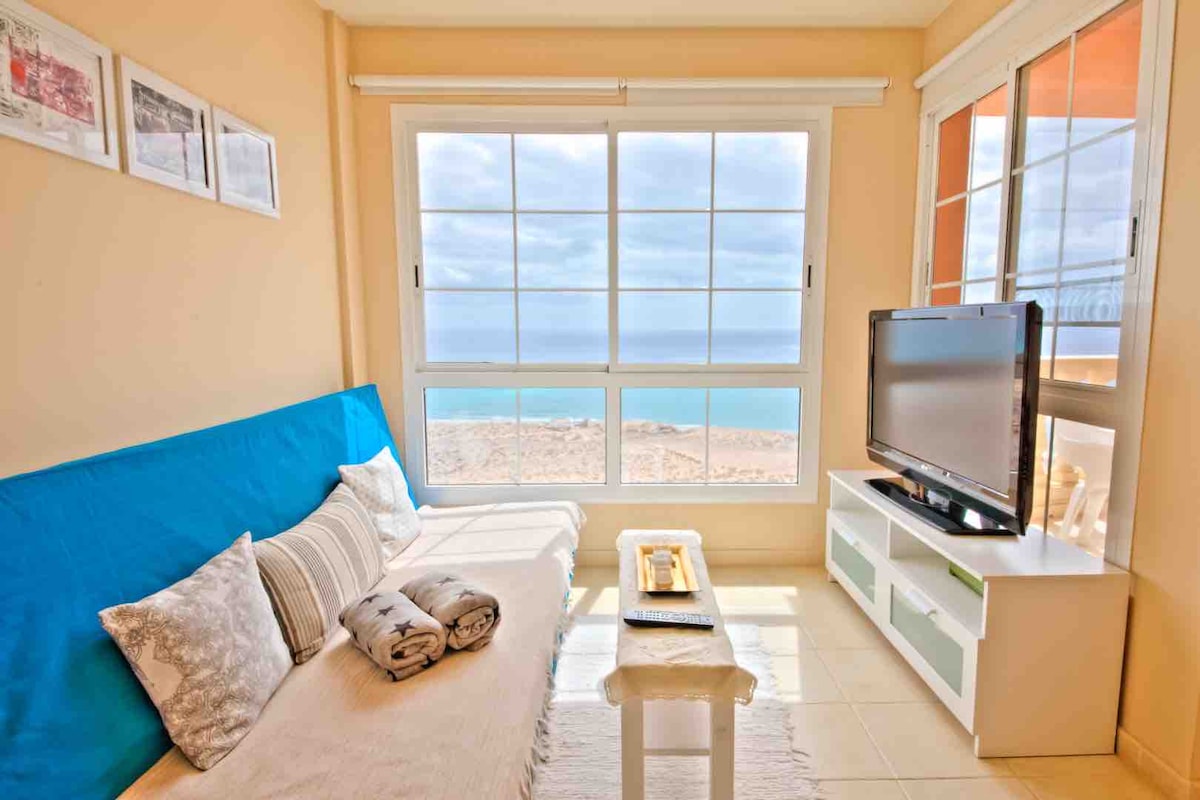 Apartamento muy luminoso, situado en el bonito y tranquilo pueblo de Tarajalejo. La vivienda se encuentra a menos d 150 metros d la playa y de su bonito paseo marítimo. A tan sólo 3km de Oasis Park y a 10 minutos de las paradisíacas playas d arena blanca. La vivienda consta de salón-comedor con aire acondicionado sofá y cocina integrada totalmente equipada, tanto para corta estancia como para larga estancia, dormitorio con almohadas y colchón de calidad, terraza soleada con bonitas vistas.