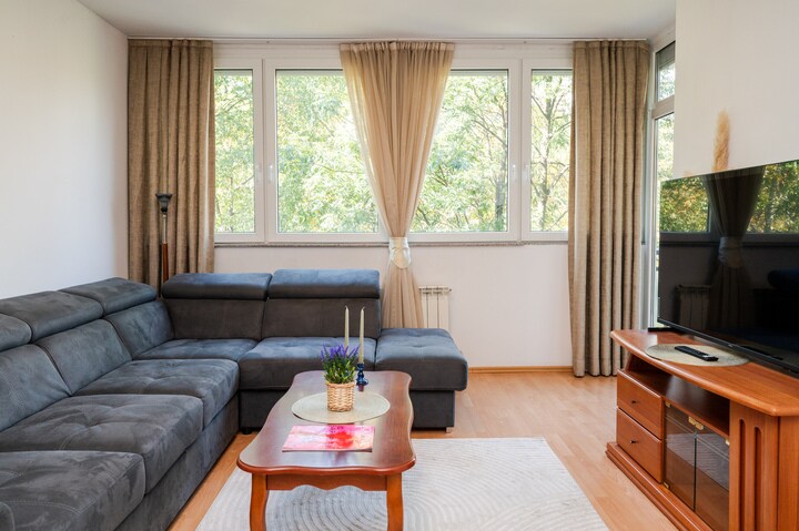 Te damos la oportunidad de relajarte, relajarte y pasar tu tiempo en nuestro hermoso y espacioso apartamento. Vas a disfrutar del ambiente en el balcón del apartamento en un barrio tranquilo que está situado a poca distancia del centro y a pocos cientos de metros de túneles y pirámides. El apartamento tiene 2 dormitorios y espacio adicional en la sala de estar si es necesario, baño con ducha, cocina con todo el equipo para preparar comidas y gran sala con TV.