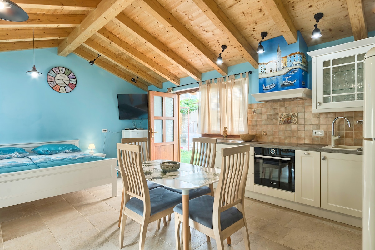 Nuestra pequeña casa es independiente (26 m2). La casa está situada en la zona recreativa verde junto al sendero para bicicletas y correr, a solo 450 metros de la hermosa atracción natural Lim Fjord o a solo 1 km de la playa marina y pública de Vrsar. Cuenta con estacionamiento privado, terraza abierta, parrilla y bonito jardín (500 m2) con olivos. El jardín y la casa tienen mucho sol durante todo el día. Está equipada con cocina americana, lavadora, ropa de cama y toallas, wifi, TV y aire acondicionado.