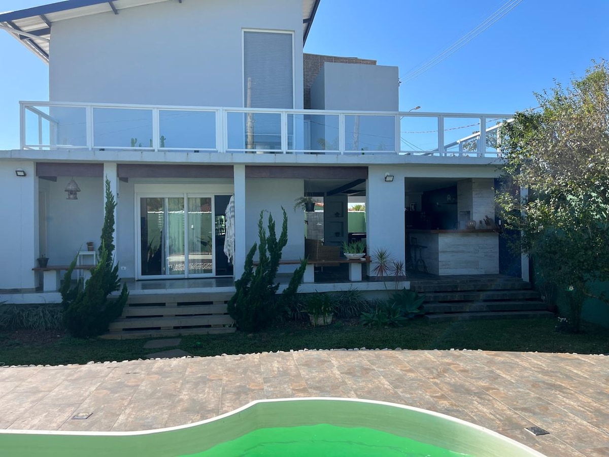 Casa ampla, arejada. Acomoda 13 pessoas Sendo 1 quarto com cama de casal e 2 quartos com 3 triliches e 2 bicamas no total 13 camas e 2 armadores para rede, 1 banheiro e 1 lavabo, Sala de estar e cozinha equipada. Mobília nova, tudo novo. IMPORTANTE: Não fornecemos roupa de cama ou de banho. Piscina com cascata, área de churrasqueira, área de laser com cama elástica e mesa de sinuca e um lindo Pergolado. A casa contém 1 câmera na área externa na garagem pegando os portões da casa