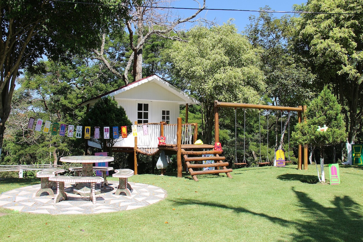 Está inserida em condomínio numa área de proteção ambiental que conta com quadra poliesportiva, de tenis, de areia, parquinho, lago para pesca esportiva, sala de jogos e brinquedoteca. A edícula tem suíte com cama de casal com bicama de solteiro. No salão tbm é possível colocar cama box de casal ou solteiro. Quiosque no jardim disponível, com churrasqueira e forno de pizza à lenha. Emprestamos raquetes de pingpong e tênis e jogos de mesa.