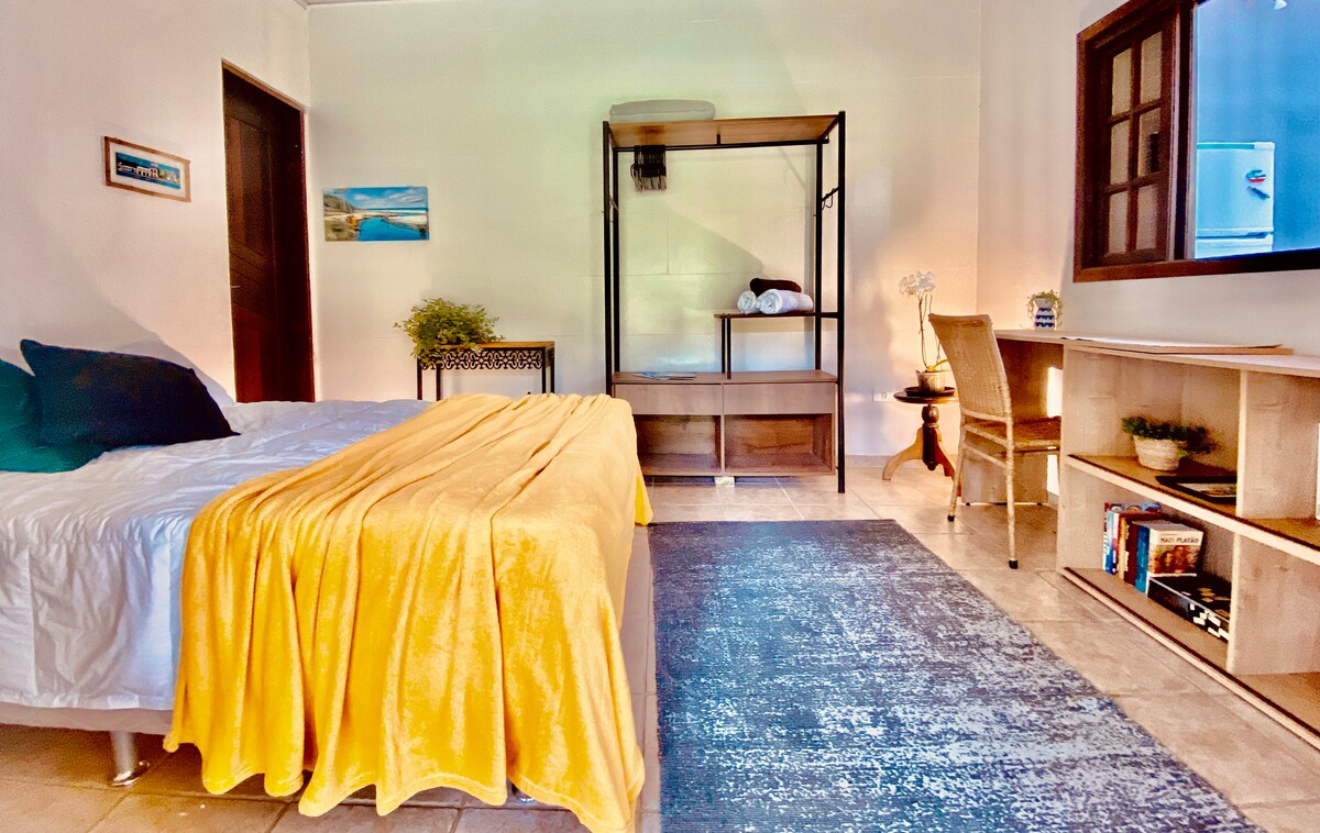 Espacio nuevo, tranquilo y encantador. Suite con cama queen, luces de lectura y ropa de cama perfumada. Una cocina con filtro de agua, encimera de dos hornillas y utensilios para preparar comidas. Balcón muy agradable, con mesa, hamaca cómoda y piscina a pocos pasos de distancia. Todo hecho con cariño para recibir a personas de buen gusto en busca de tranquilidad. La serenata está a cargo de la sinfonía de la Mata Atlántica de Ilhabela, una de las islas más bellas de la costa brasileña.