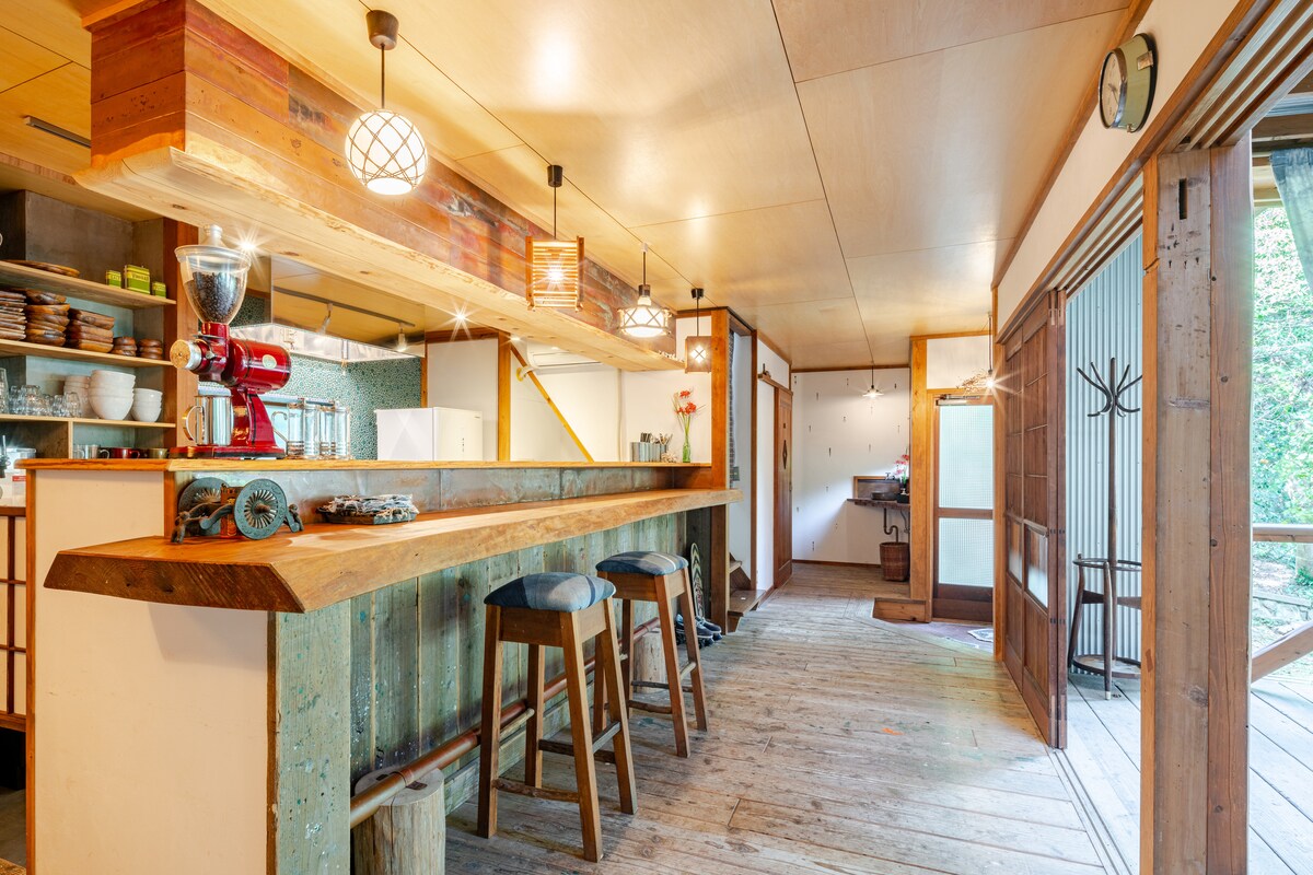 “TAKUMI‗AN” es un edificio histórico de una época pasada, ubicado en la zona de Toda/Sawakai, rodeado por un puerto pesquero, montañas cubiertas de cerezos en flor y huertos de cítricos. Ha renacido como una moderna casa de jardín con estructura de madera en un entorno natural virgen.Esta es la “experiencia del estilo de vida japonés” por excelencia, donde puede disfrutar del ritmo de vida intenso y fluido. [Serenidad matutina y una cocina para saborear la temporada] La cocina con jardín de nueva construcción es un escenario especial para disfrutar de un desayuno elegante rodeado por el verde de las montañas.Prepare café molido a mano y sienta la brisa de la temporada.Un gesto matutino tan cortés despierta una sensación de la vida cotidiana que se había olvidado. [Bar privado por la noche con chimenea] Cuando se pone el sol, la terraza de madera se convierte en un bar privado solo para ustedes.Hable con sus seres queridos con el sonido del fuego crepitando de fondo.En el silencio, aislados del mundo exterior, la noche se hace más profunda. [La alegría del descubrimiento y la comodidad de la vida] Si camina hasta el cabo, disfrutará de una vista espectacular del monte Fuji flotando en el mar.Descubra esta vista por su cuenta y disfrute de la alegría de integrarse a la vida de la ciudad portuaria.Equipado con cocina completa, secadora de gas y wifi de alta velocidad, le prometemos la comodidad de una estancia prolongada. Redescubra aquí el ritmo atemporal de la vida japonesa.