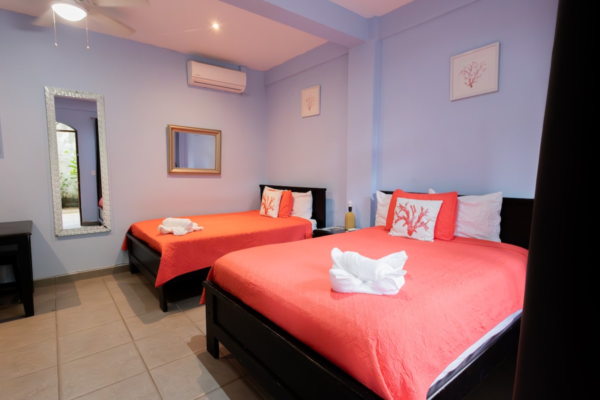 This room is comfortable, fitting about 3-6 people. We have a communal outside kitchen with a patio, barbecue, and a beautiful landscape of colorful & local plants. You can cook a delicious meal or make a cup of coffee and relax with a book by the pool. We also accept furry friends! All rooms have AC, WIFI, Hot Water, Private Bathroom, and a Mini Fridge. Very close to the hotel you will find various restaurants to enjoy a relaxed meal. Nearby there are multiple stores to buy food & drinks.